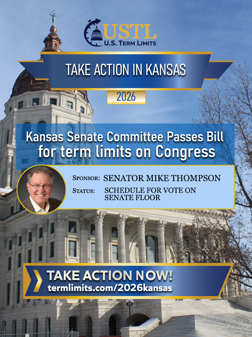 For immediate release February 26, 2026Contact: Shanna Chamblee, U.S. Term Limitsschamblee@termlimits.com Kansas Senate Committee Passes Resolution to Term Limit Congress Kansas City, KS — The Kansas Senate Federal and State Affairs Committee passed House Concurrent Resolution 5022 (HCR5022), which proposes a congressional term limits amendment to the U.S. Constitution. The