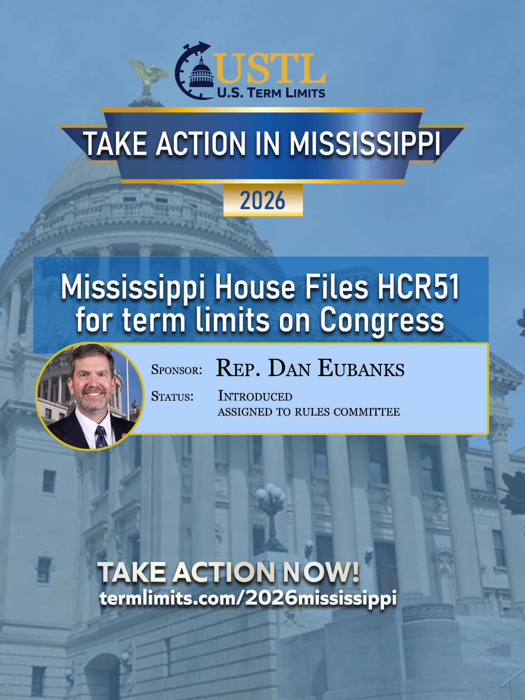 For immediate release March 9, 2026Contact: Scott Tillman, U.S. Term LimitsPhone: (321) 345-7455press@termlimits.com Representative Dan Eubanks Files Congressional Term Limits Resolution in Mississippi JACKSON, MS – Representative Dan Eubanks has filed House Concurrent Resolution 51 (HCR 51) to add Mississippi to the growing list of states applying to propose a