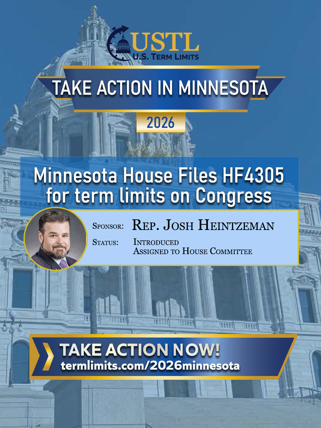 For immediate release March 17, 2026Contact: Scott Tillman, U.S. Term LimitsPhone: (321) 345-7455press@termlimits.com Representative Josh Heintzeman Files Congressional Term Limits Resolution in Minnesota ST. PAUL, MN – Representative Josh Heintzeman has filed HF4305, a joint resolution to add Minnesota to the growing list of states applying to propose a congressional