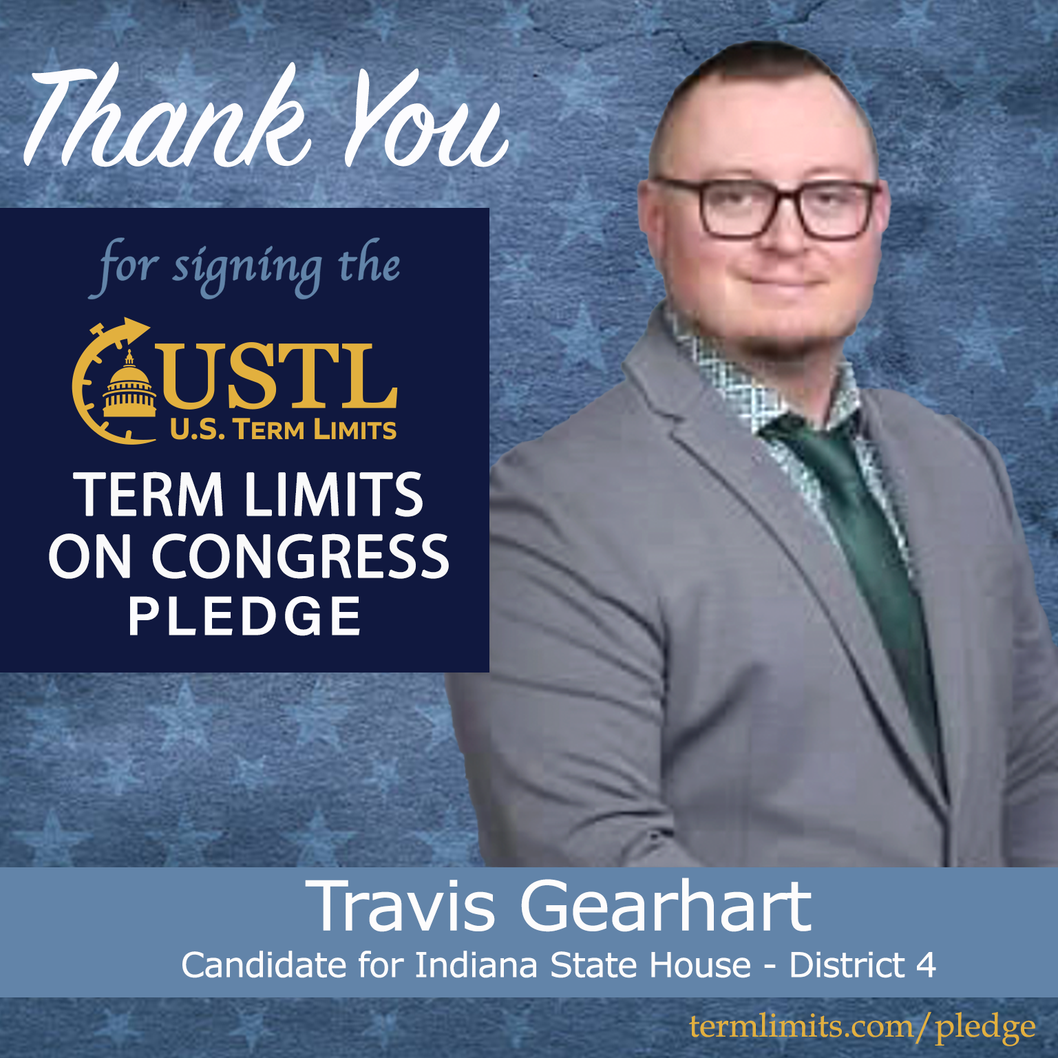 For immediate release April 8, 2026 Contact: Scott Tillman, U.S. Term LimitsPhone: (321) 345-7455stillman@termlimits.com Travis Gearhart Pledges to Support Congressional Term Limits Valparaiso, IN – U.S. Term Limits (USTL),